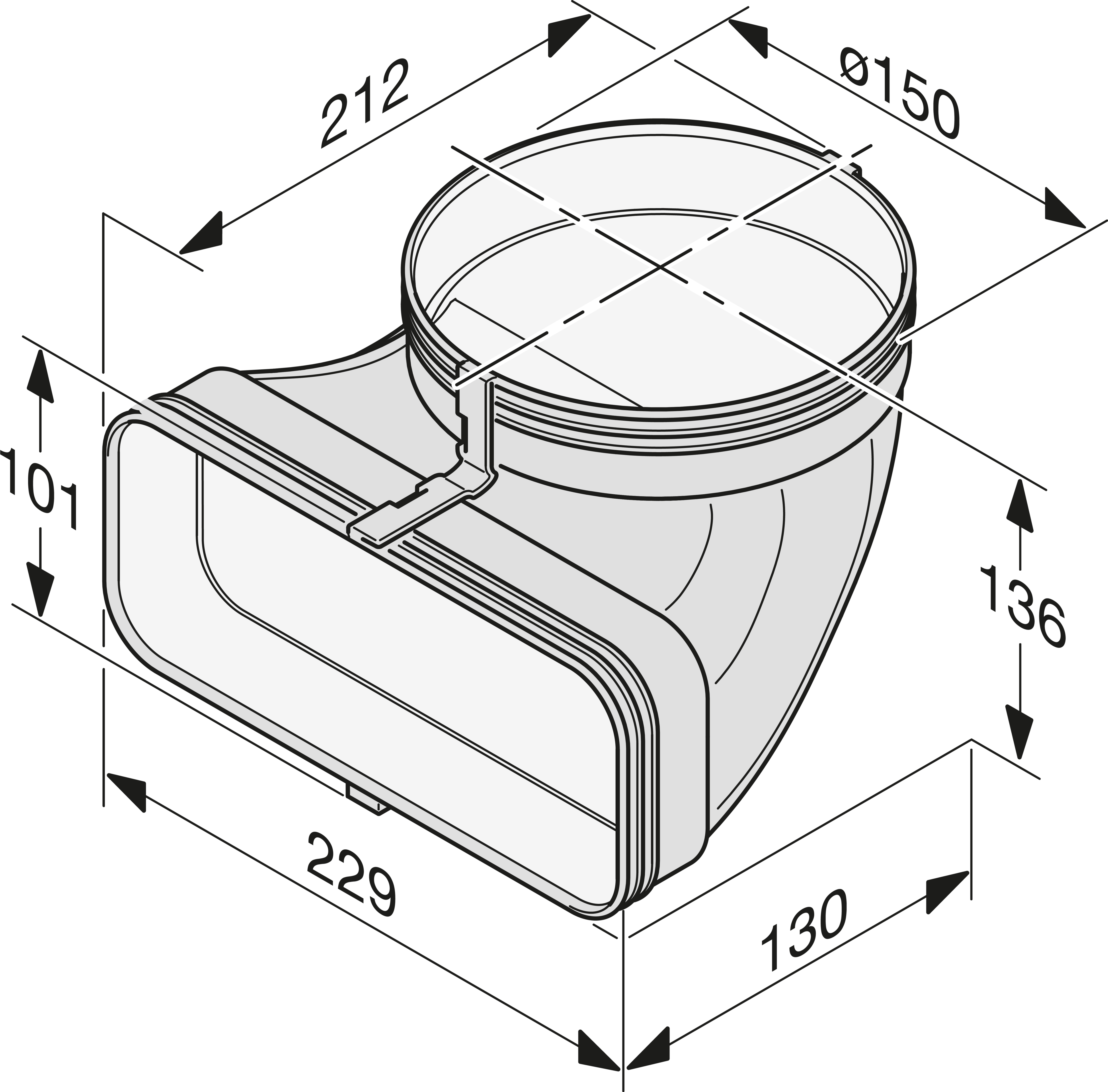 Адаптер с прямоугольного сечения на круглый 90°, глубина 130 мм, высота 136 мм