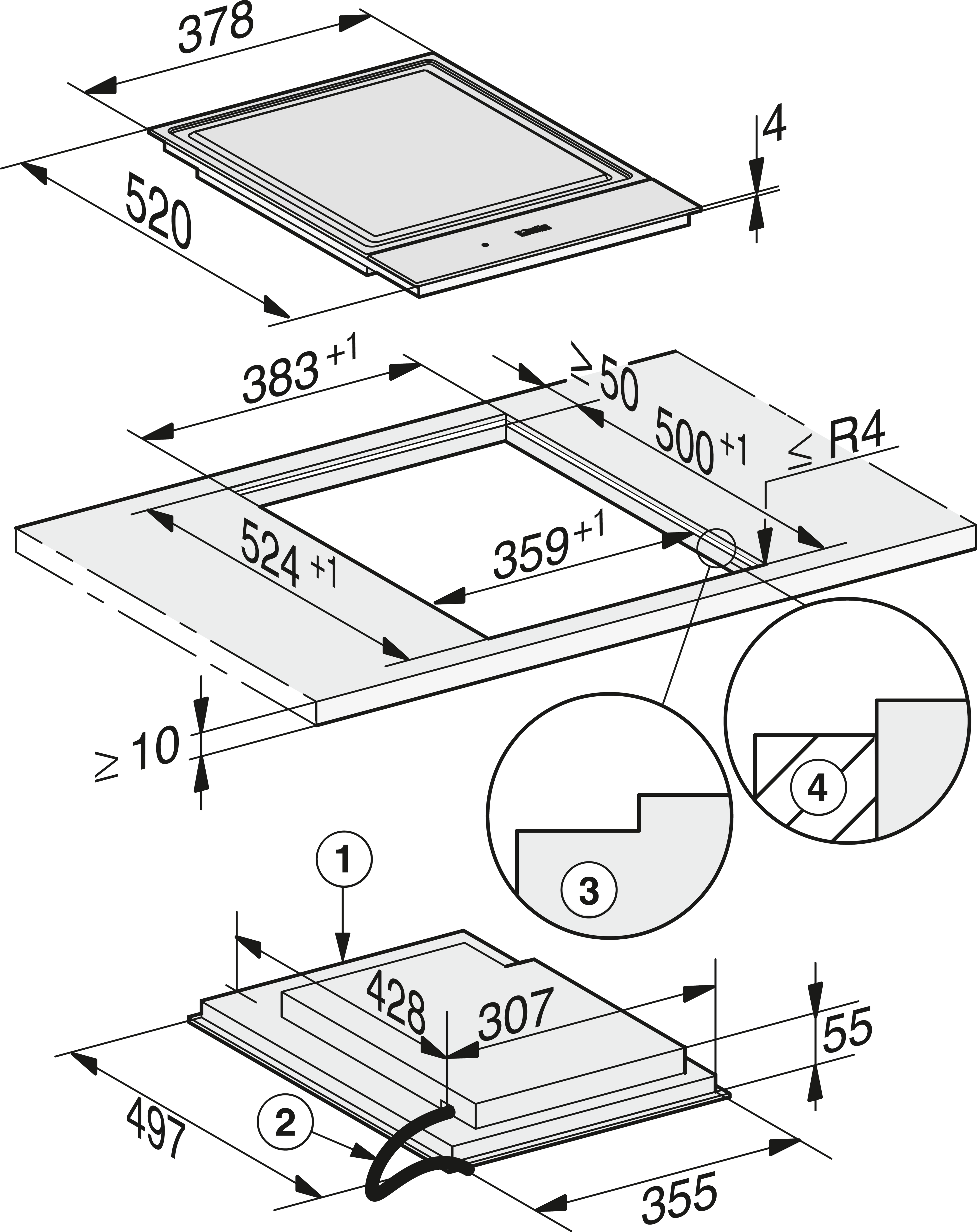 Внутренние размеры выреза в мм (глубина) для встраивания заподлицо