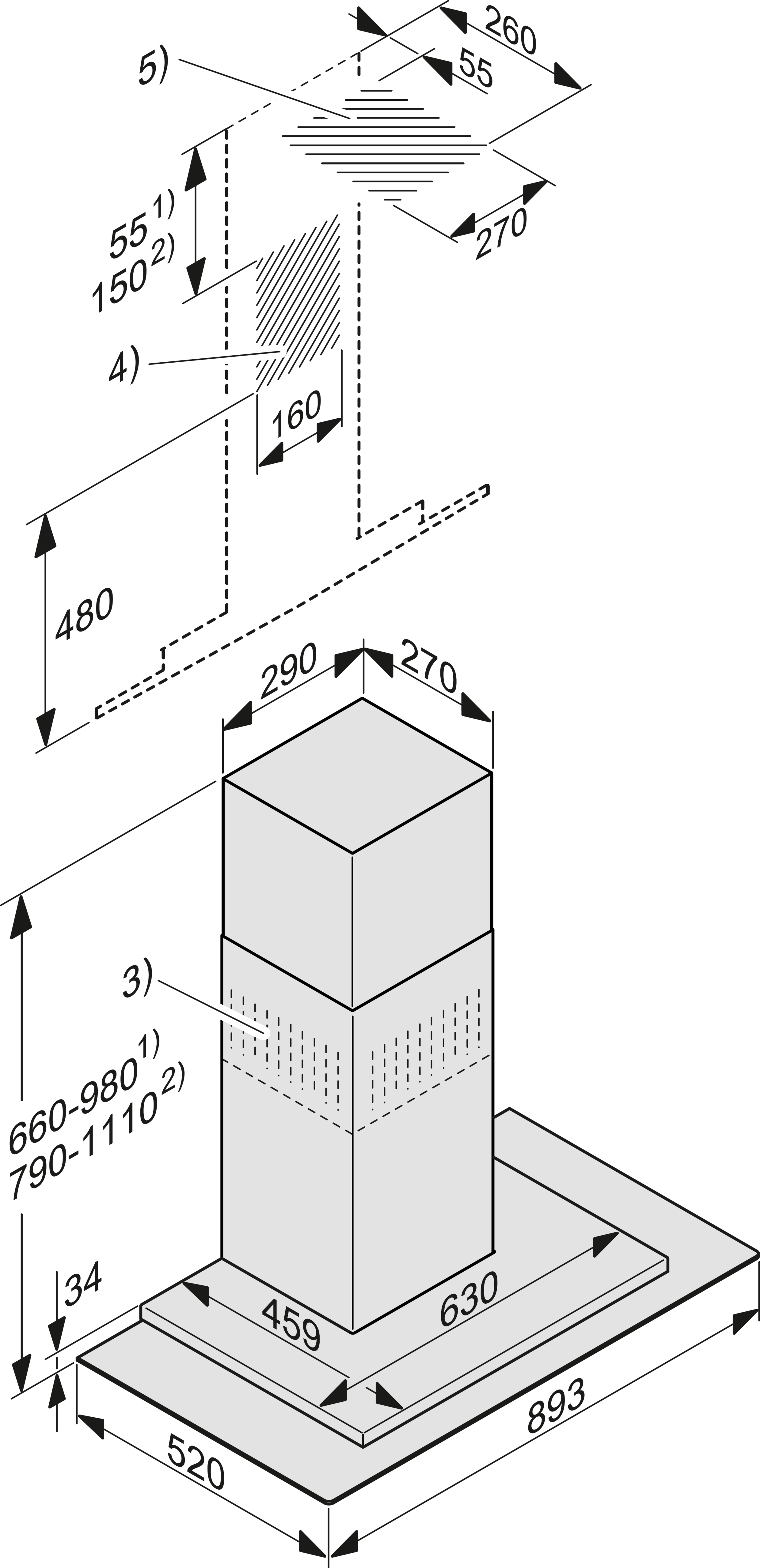 Высота корпуса вытяжки, мм