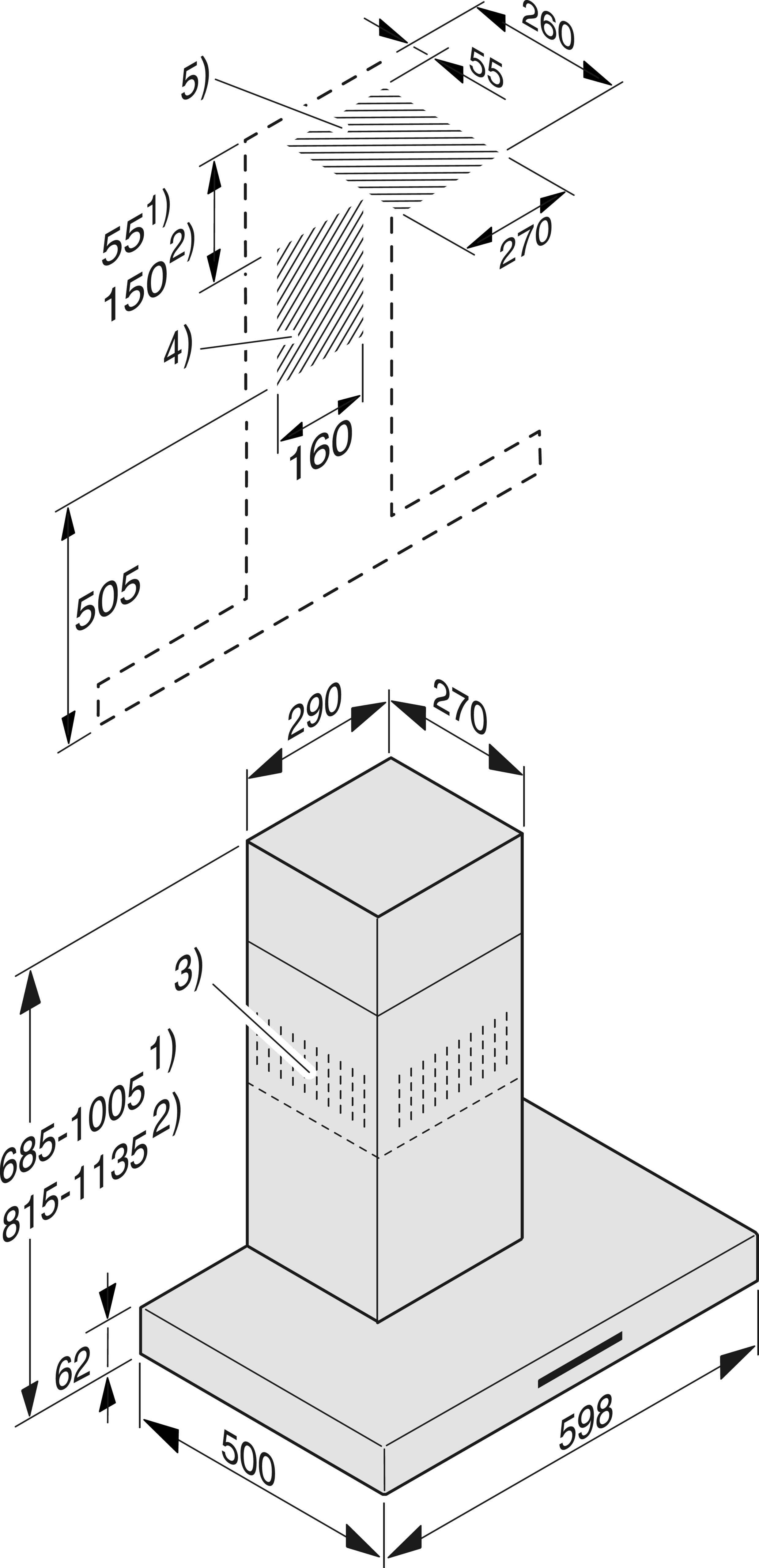Общая высота вытяжки для режимов отвода воздуха и отвода с выносным вентилятором минимально (мм)